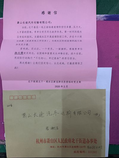 近日,蕭山長運公司黨委下屬客運黨支部收到一封來自北干街道北干一苑社區新冠肺炎防控臨時黨支部送來的感謝信,對黨員孫大勇同志積極支援社區開展疫情防控工作表示感謝。