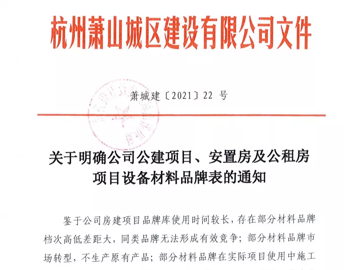 蕭城建〔2021〕22號 關于明確公司公建項目、安置房及公租房項目設備材料品牌表的通知