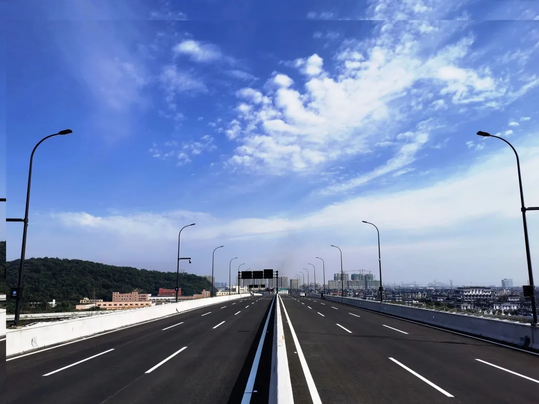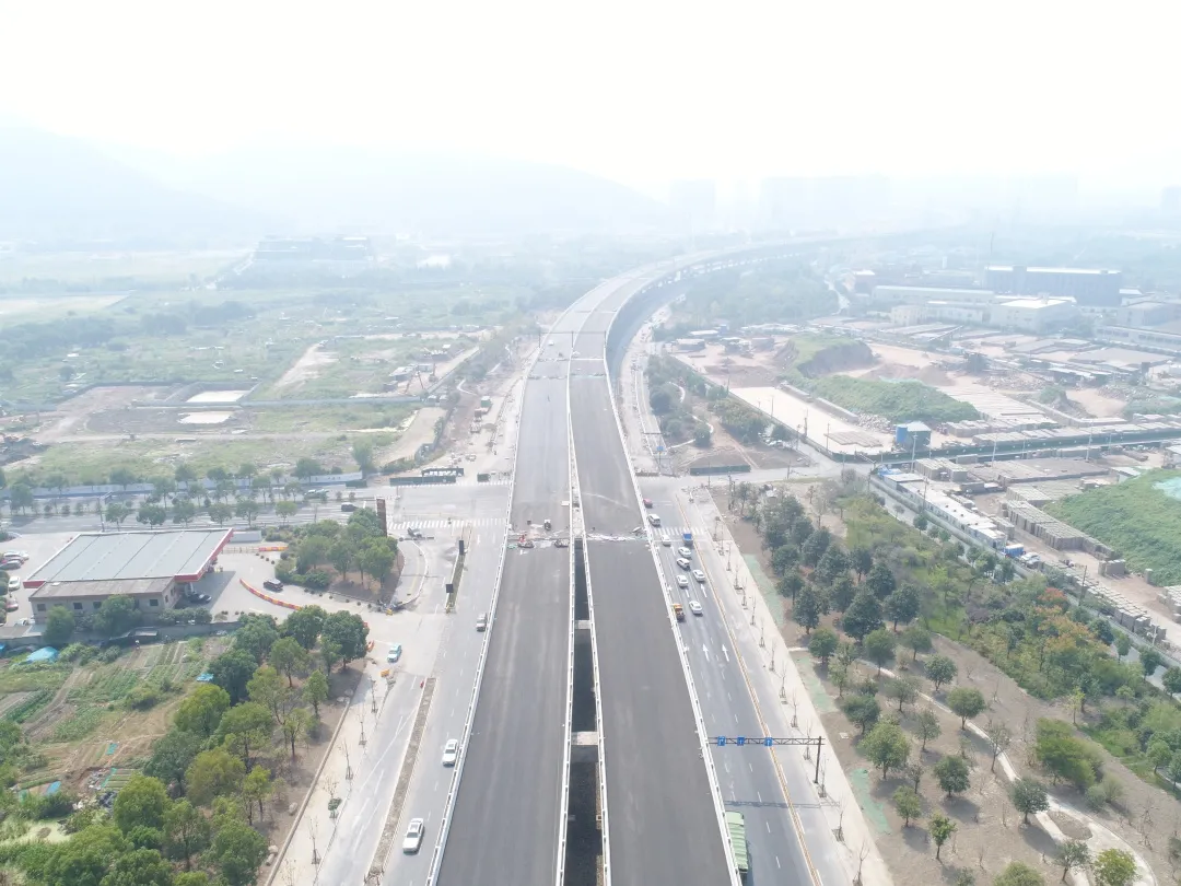 高架橋已完成交工驗(yàn)收,正在開展通車前準(zhǔn)備工作;地面道路完成56%。