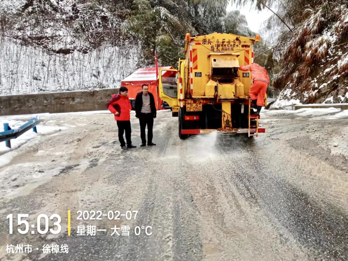 上午,由于我區出現明顯雨雪天氣過程,雪雨量中到大,南片樓塔、河上、戴村等鄉鎮有明顯積雪。會議結束后,公司負責人徐全民迅速出發趕赴徐樟線指導抗雪工作。截至下午3點,公司共出動搶險小組5組人員179人次,撒布機3臺次,輕便型除雪機3臺次,高壓沖洗車10臺次,鏟車1臺次,斜角掃雪器1臺次,撒布融雪劑6噸、工業鹽5噸,草包50只,其它車輛39臺次,路面積雪基本清除,通行正常。