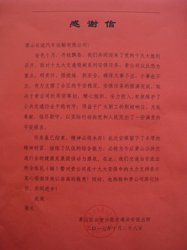 感謝信中提到,“面對十九大交通領域系列安保任務,貴公司以反恐為重點,明責任、強措施、抓安全,確保大事不出,小事也不出,有力支撐了全區(qū)的平安穩(wěn)定。安保任務的圓滿完成,取決于貴公司的周密籌劃,精心組織,全力投入,有效維護了公共交通行業(yè)平穩(wěn)有序;得益于廣大職工的積極響應,無私奉獻,恪盡職守,以實際行動向黨和人民交出了一份滿意的平安報表”。