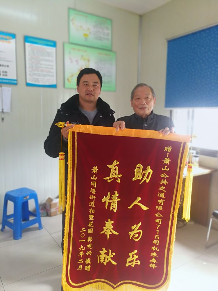 3月11日下午,蕭山公交六車隊聞堰站房里迎來了一位老人,他手里緊攥著一卷東西,嘴里不住的表達對公交師傅的感謝。大家徐徐打開,一面錦旗赫然出現在眼前,原來老人是來感謝716路朱森峰師傅的。