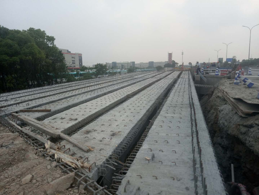 原雷山橋位于紅十五線與雷山河交界之上,新建成總長為40.5M(其中跨徑20M*2)、可供雙向六車道通行。在施工過程中為保證邊通車邊施工的安全,確保此次安裝能順利完成,3標項目部領導和技術員在梁板安裝前對現場作業人員進行了詳細的施工技術及安全交底,現場施工過程中,技術人員認真核對設計圖紙,嚴格做好抓安全、保質量工作,對每道工序施工質量和報驗程序進行嚴格把關,保證各道工序層層落實到位。監理組全過程進行旁站對施工各環節進行監控。本次梁板安裝,施工單位配備相關工作人員24名,其中有起重工6名,運輸車司機4名、吊車司機2名、指揮1名、以及其他相關工作員11名。主要使用一輛100T吊機和一輛80T龍門吊用于現場吊裝作業,4輛T梁運輸車用于梁板運輸,電焊機2臺用于焊接鋼筋。